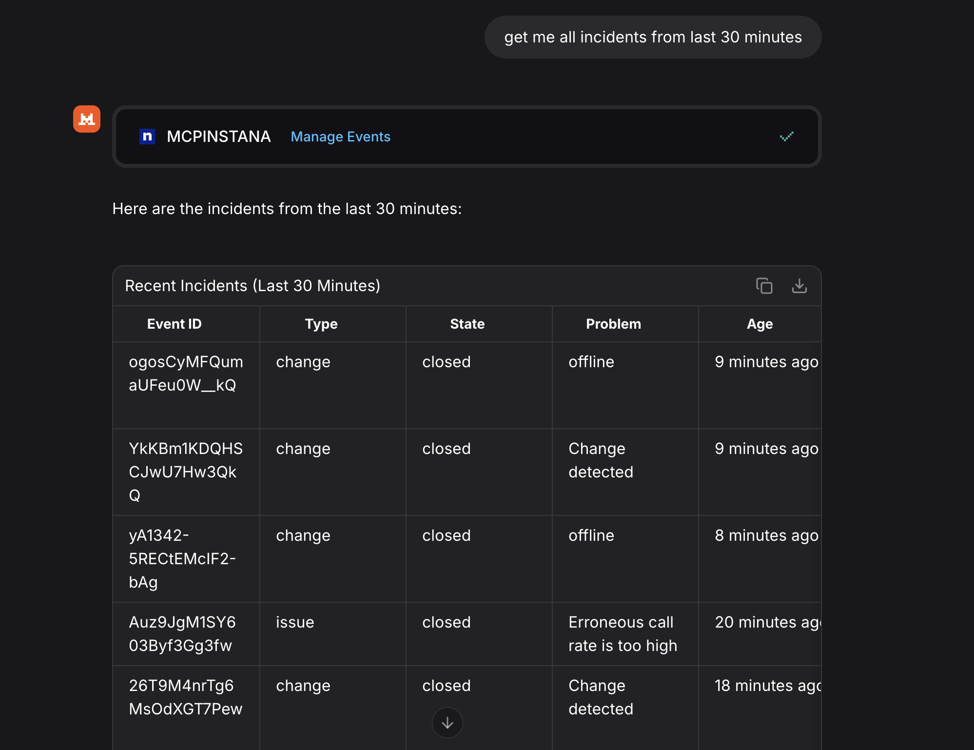 MCPServer->>Instana: Retrieve alerts for application robot-shop