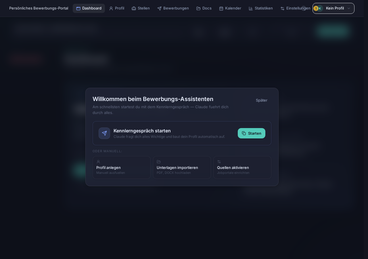 | Dashboard | 8 Tabs: Dashboard, Profil, Stellen, Bewerbungen, Dokumente, Kalender, Statistiken, Einstellungen |