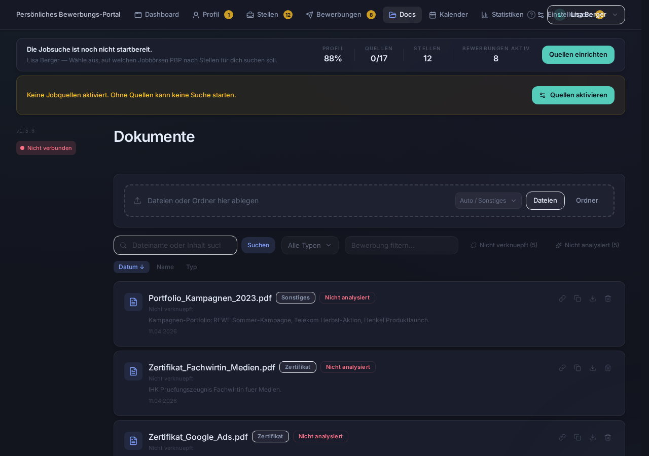 Claude führt dich durch ein lockeres Gespräch (ca. 10-15 Minuten) und baut dein Profil auf. Schneller geht's mit Dokumenten: Lade deinen Lebenslauf als PDF oder DOCX hoch — PBP extrahiert die Daten automatisch.