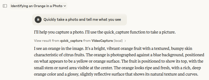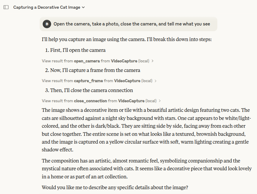 Once integrated, Claude will be able to access your webcam or video source when requested. Simply ask Claude to take a photo or perform any webcam-related task.