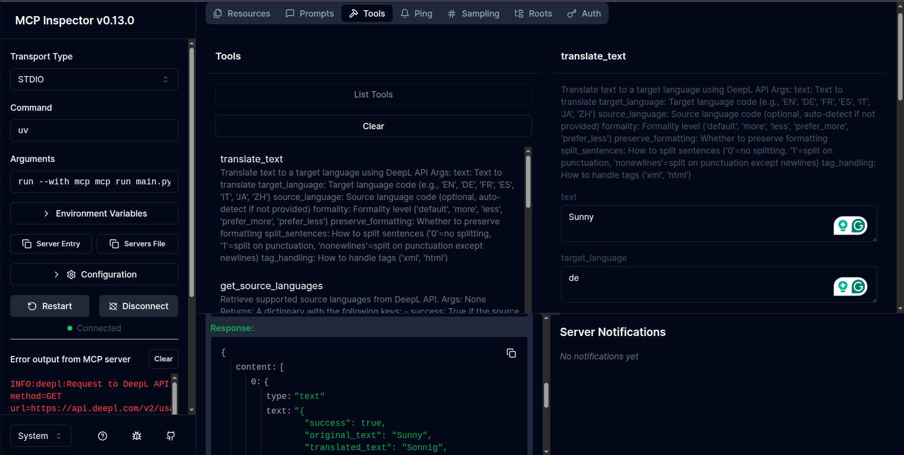 DEEPL_AUTH_KEY(required): Your DeepL API key.DEEPL_SERVER_URL(optional): Override the DeepL API endpoint (default:https://api-free.deepl.com).