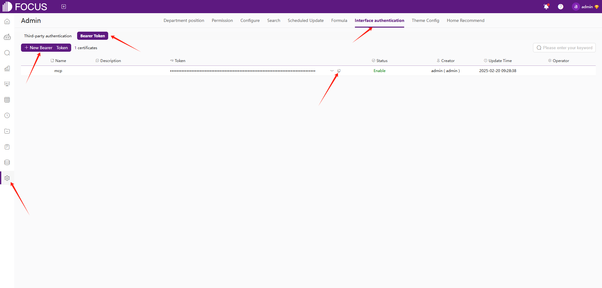 - Admin -> Interface authentication -> Bearer Token -> New Bearer Token