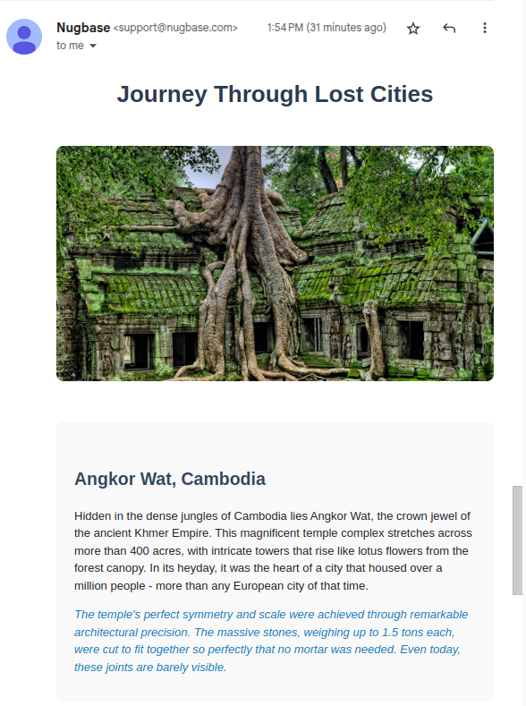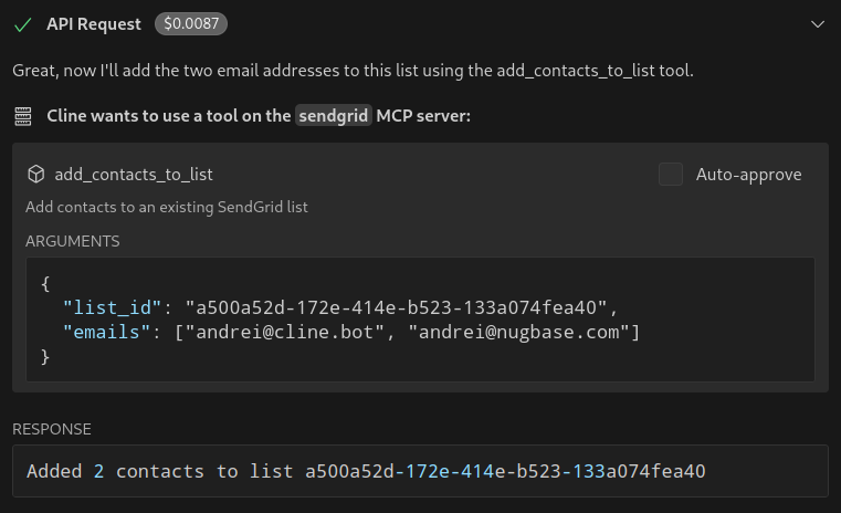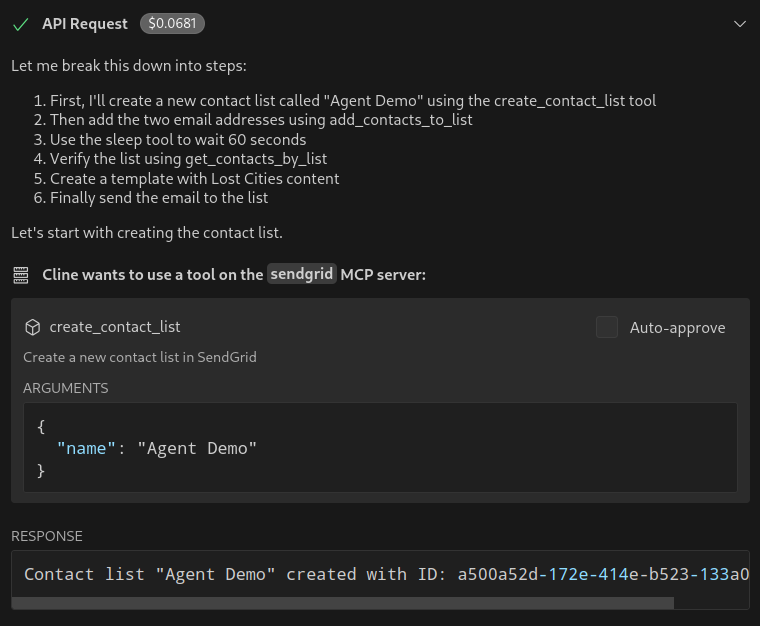 In this demo, we ask the Cline SendGrid agent to make a new contact list, add my emails to it, automatically generate a template for Lost Cities facts, and send the email to the list. In this process, Cline will automatically realize that it needs to know the verified senders we have, and which unsubscribe group to use. A pretty email is delivered to my inboxes, delighting me with Lost Cities!