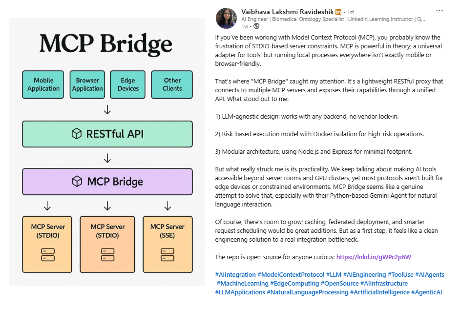 LinkedIn Post by Vaibhava Lakshmi Ravideshik - A LinkedIn Learning Instructor discussion about MCP Bridge's practical applications