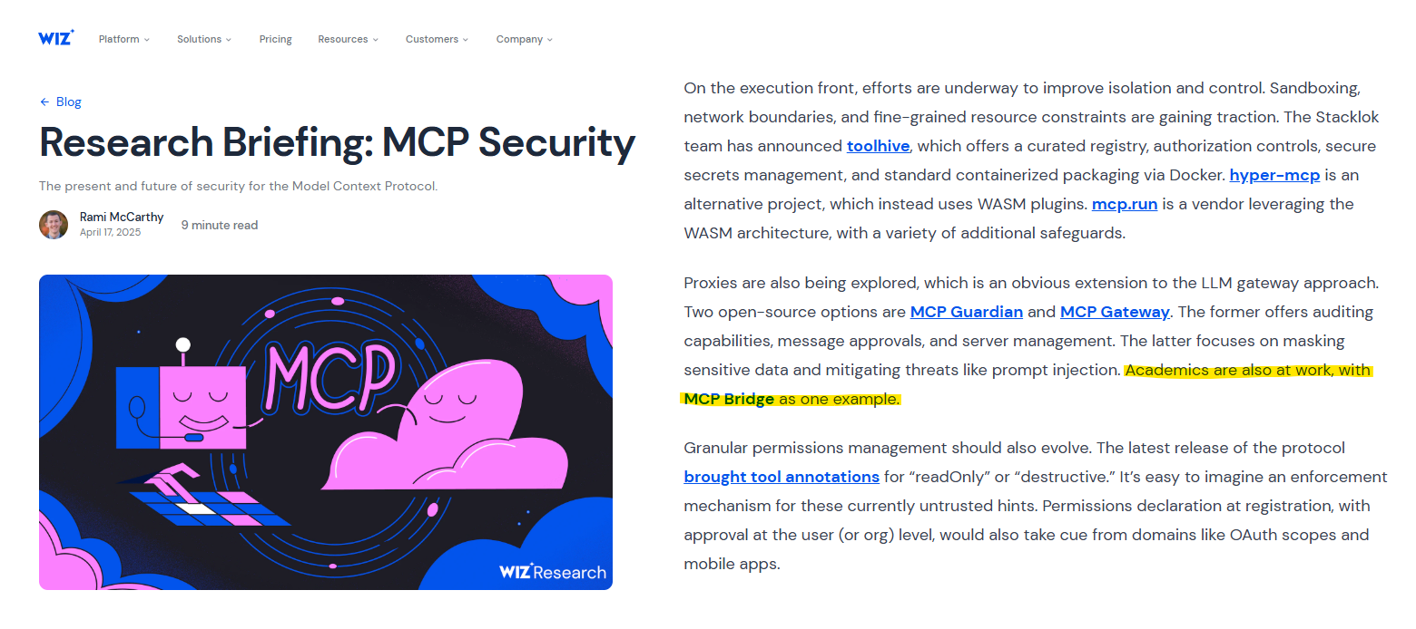 Research Briefing: MCP Security - Wiz security research highlighting MCP Bridge as an example of academic work in the MCP ecosystem