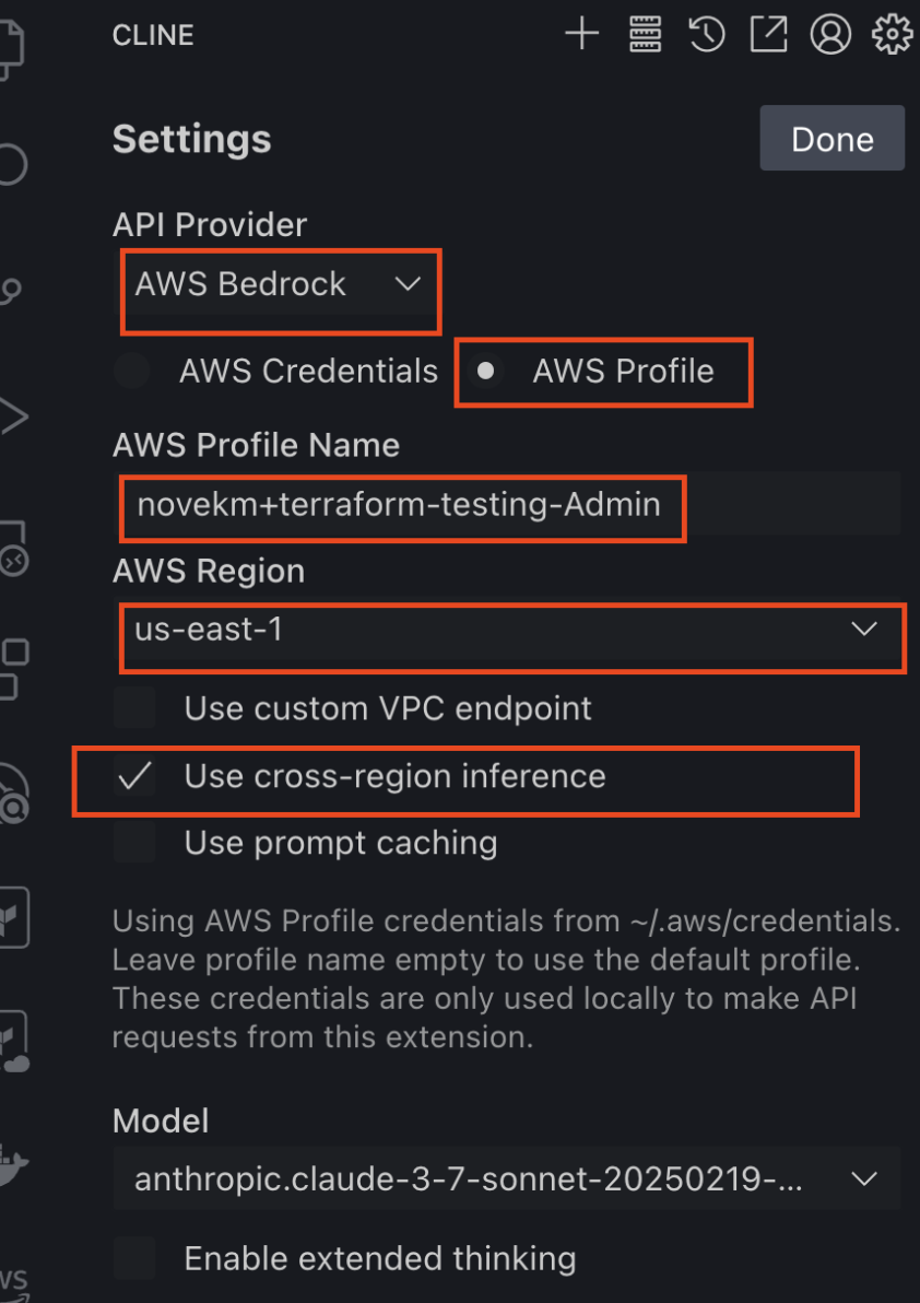 - Fill out the configuration based on the existing AWS Profile you wish to use, select the desired AWS Region, and enable cross-region inference.
