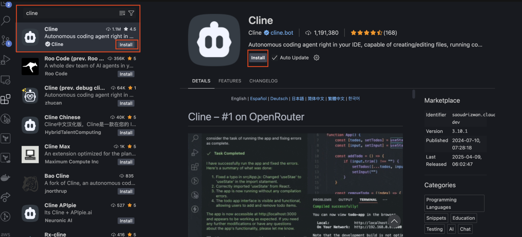 Planwhich will provide the output for you to take manual action on (e.g. providing you a sample configuration that you copy and paste into a file). However, you can optionally toggle this toActwhich will allow Cline to act on your behalf (e.g. searching for content using a web browser, cloning a repository, executing code, etc). You can optionally toggle on the "Auto-approve" section to avoid having to click to approve the suggestions, however we recommend leaving this off during testing, especially if you have the Act toggle selected.