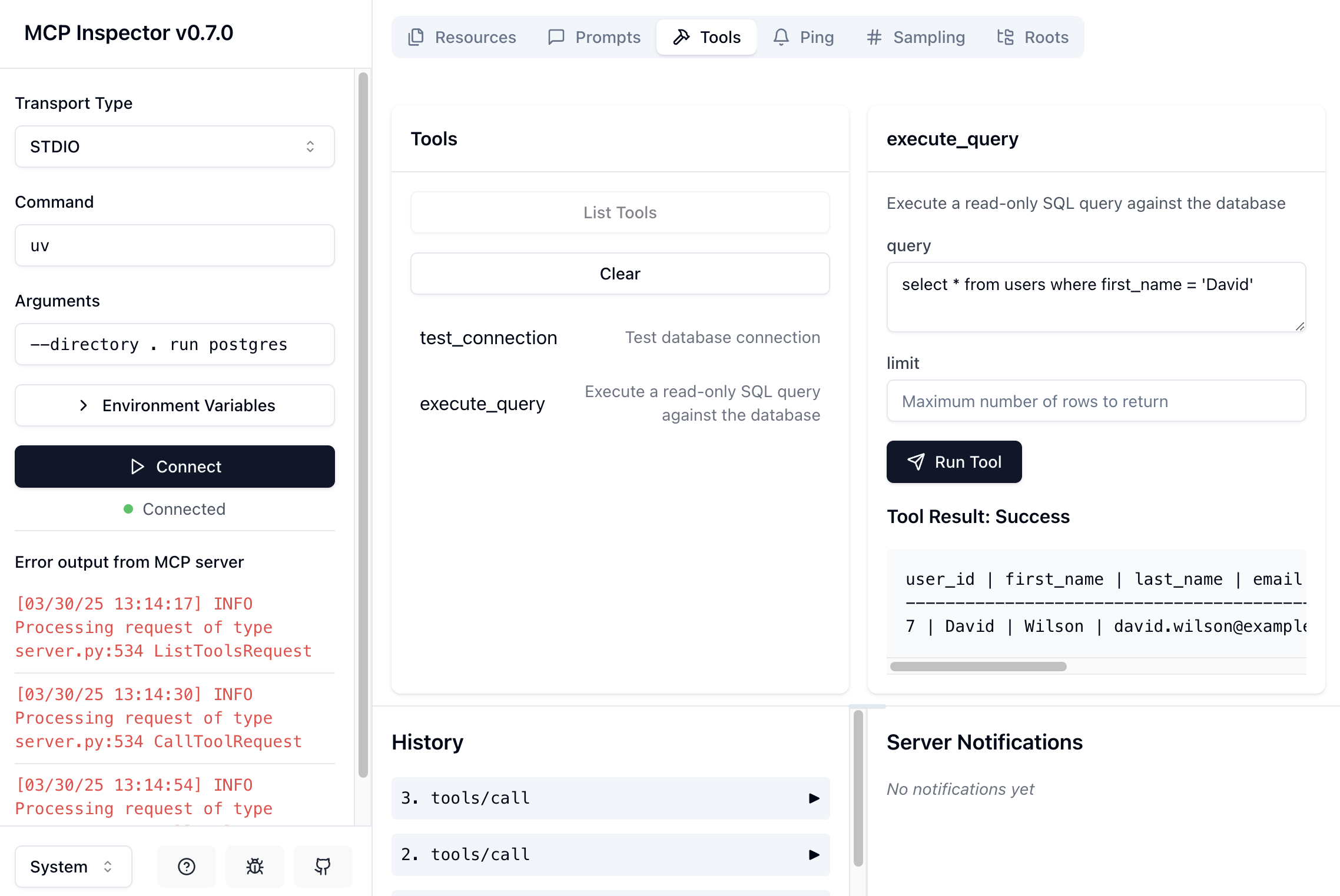 # Replace with YOUR actual database credentials npx @modelcontextprotocol/inspector uv --directory . run postgres -e DSN=postgresql://username:password@hostname:port/database -e SCHEMA=publicNote: If this is your first time running npx, you'll be prompted to approve the installation. Type 'y' to proceed.