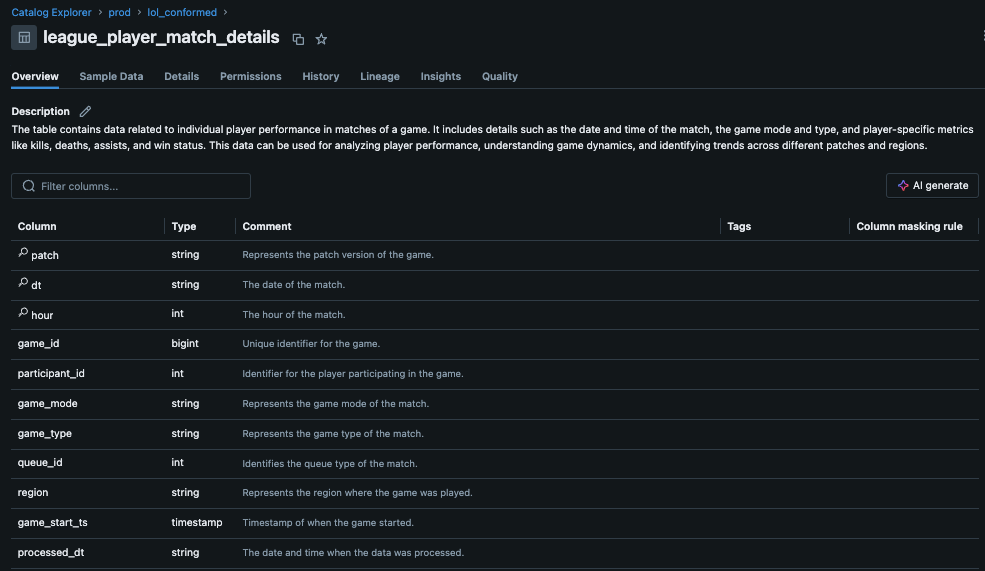 Fig 2: Column-level descriptions in Unity Catalog. These details are passed to the LLM, aiding its understanding of the data structure for precise SQL generation.