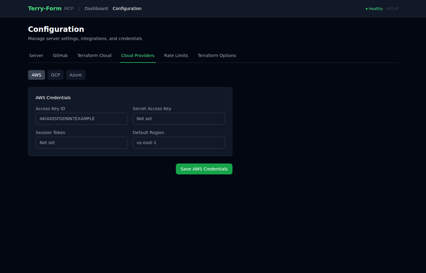 These variables are forwarded directly to the Terraform subprocess. Set them to authenticate with your cloud provider.