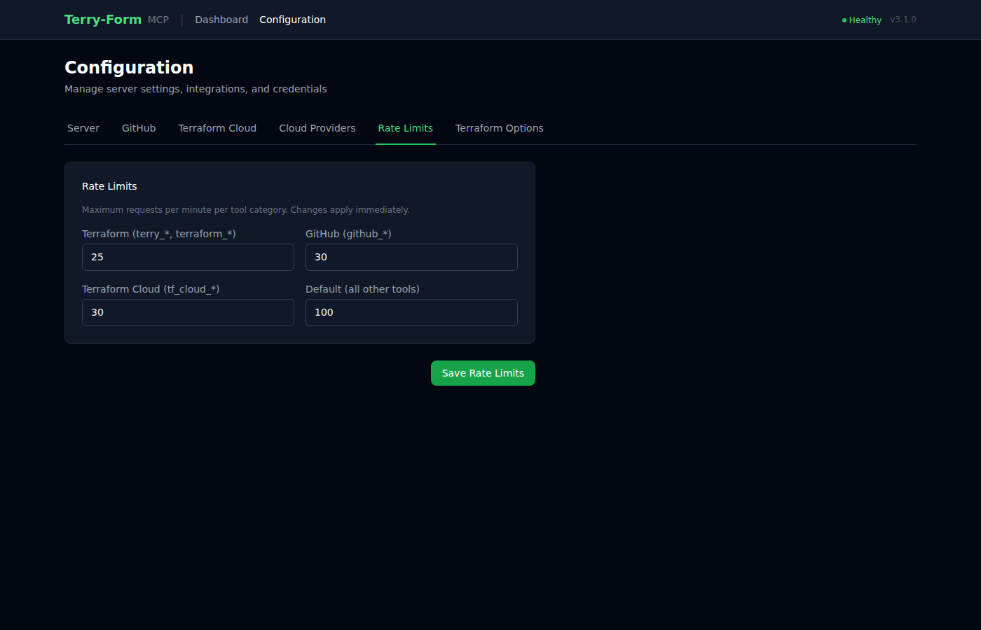 TERRY_RATE_LIMIT_TERRAFORM | Terraform operations per minute | 20 | No |