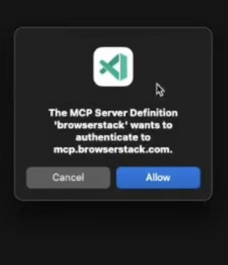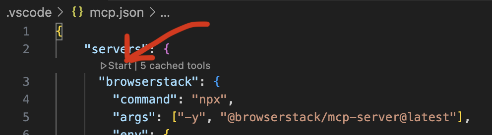 { "servers": { "browserstack": { "command": "npx", "args": ["-y", "@browserstack/mcp-server@latest"], "env": { "BROWSERSTACK_USERNAME": "<username>", "BROWSERSTACK_ACCESS_KEY": "<access_key>" } } } }- In VSCode, make sure to click on