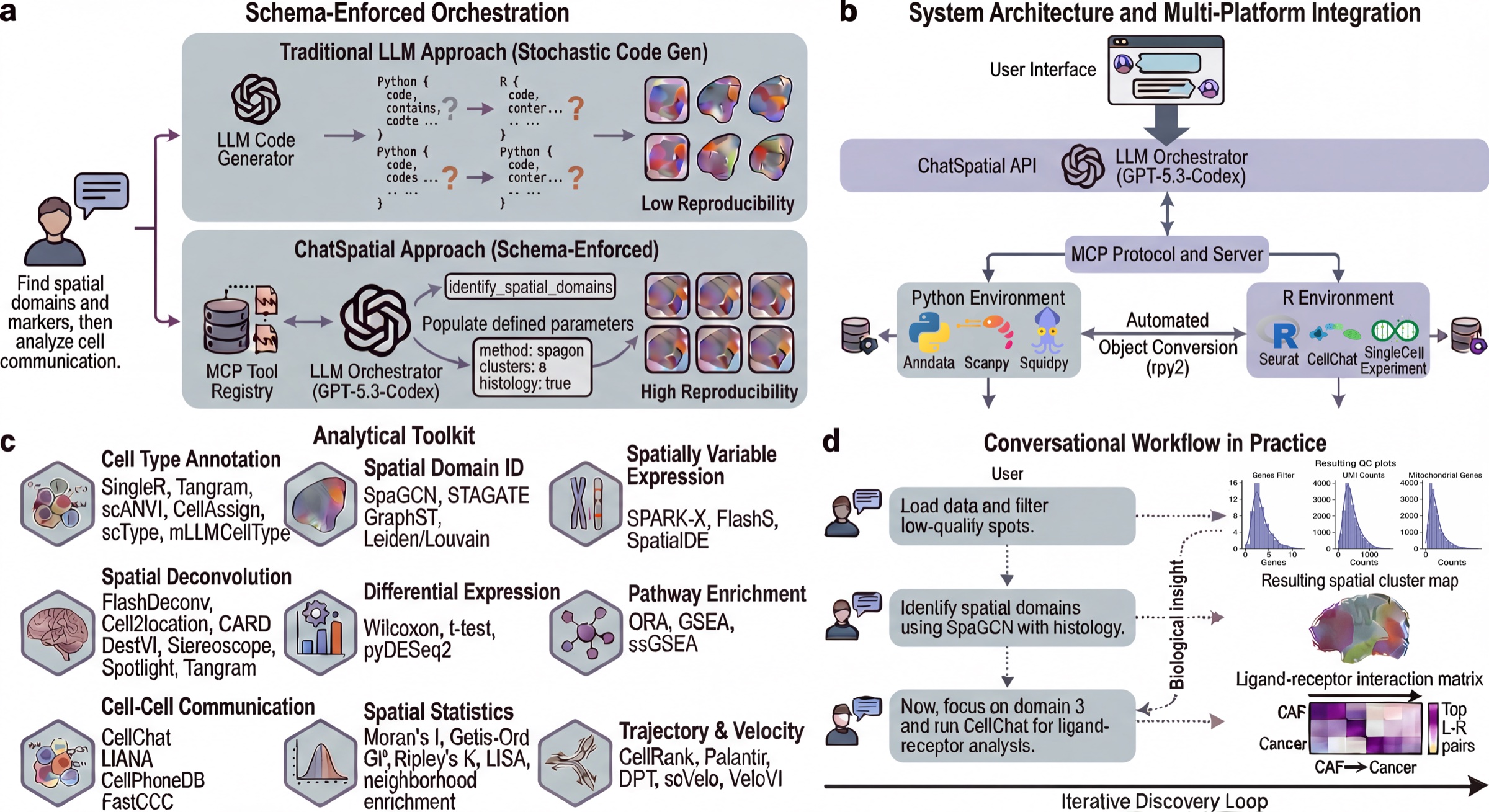 ChatSpatial replaces ad-hoc LLM code generation with schema-enforced orchestration. Instead of generating arbitrary scripts, the LLM selects tools and parameters from a curated registry, making spatial transcriptomics workflows more reproducible across sessions and clients.