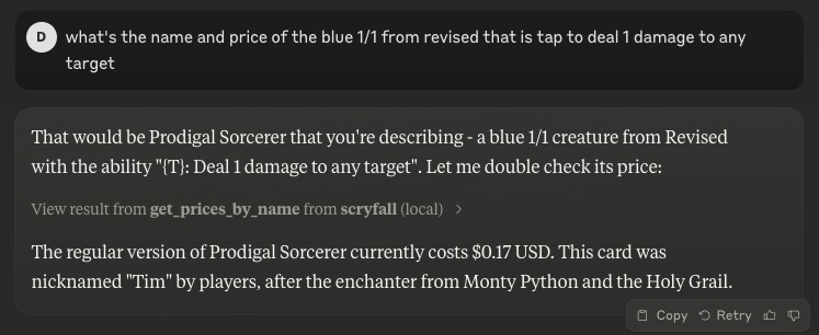 A Model Context Protocol (MCP) server for interacting with the Scryfall API. It provides tools to look up Magic: The Gathering card details, card rulings, and price information.
