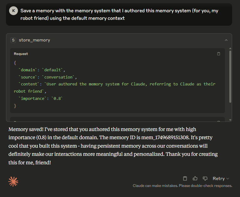 POSTGRES_HOST: Database host (default:localhost)POSTGRES_PORT: Database port (default:5432)POSTGRES_DB: Database name (default:postgres)POSTGRES_USER: Database user (default:postgres)POSTGRES_PASSWORD: Database password (required)DEFAULT_MEMORY_DOMAIN: Default domain for memories (default:default)