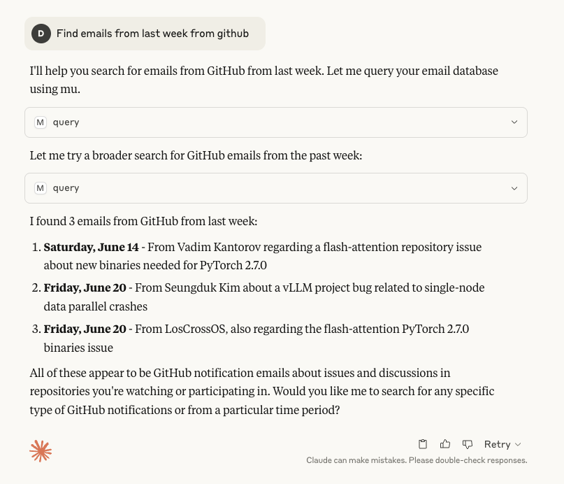 A Model Context Protocol (MCP) server for querying your local mu mail index. This server enables fast, structured mail search from Claude Desktop and other MCP clients.