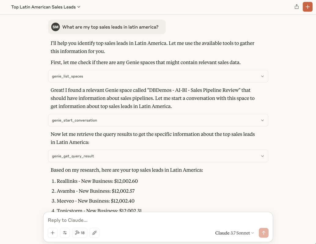 - Genie spaces: for each Genie space, the server exposes tools for managing conversations and sending questions to the space