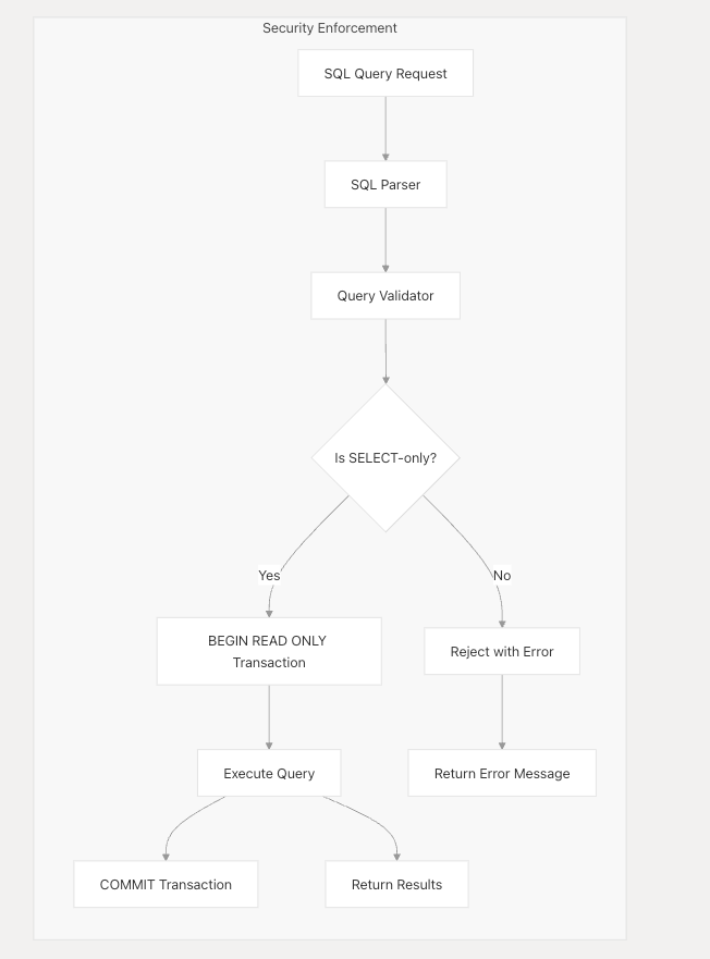 1.SQL query validation to allow only SELECT statements 2.Execution of all queries within READ ONLY transactions 3.No support for data modification operations (INSERT, UPDATE, DELETE, etc.) 4. No support for database schema modification (CREATE, ALTER, DROP, etc.)