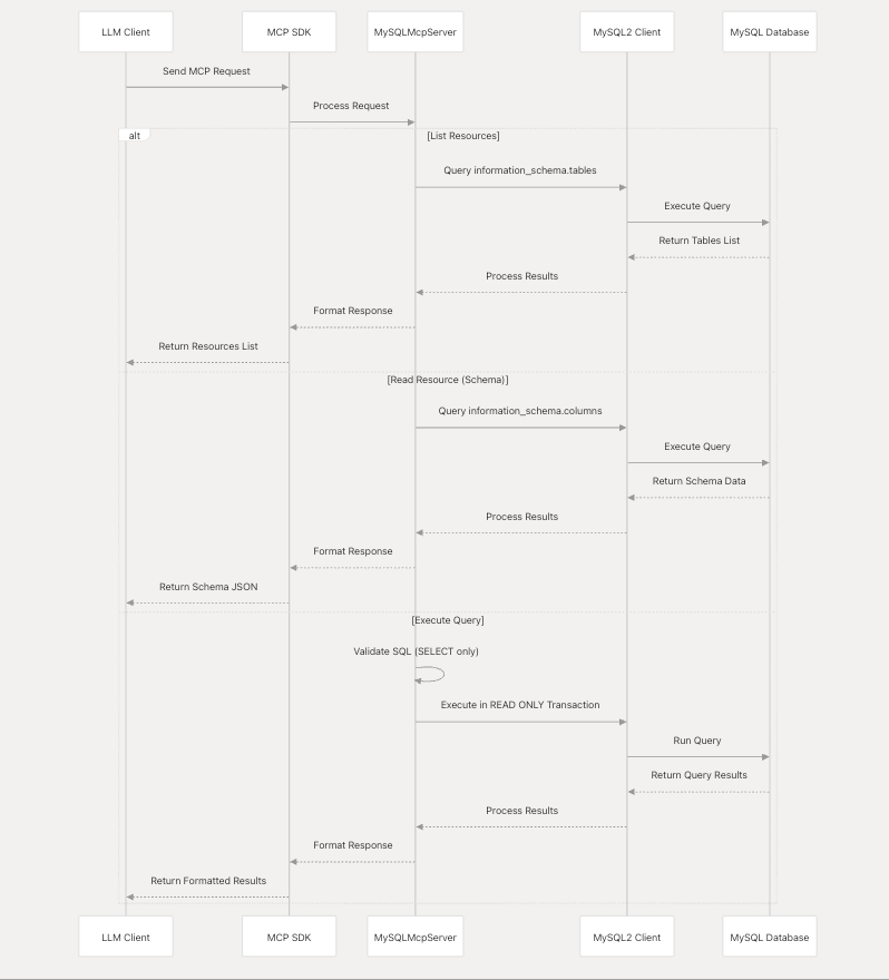 The MySQL MCP Server implements a strict security model to ensure that database access is read-only.
