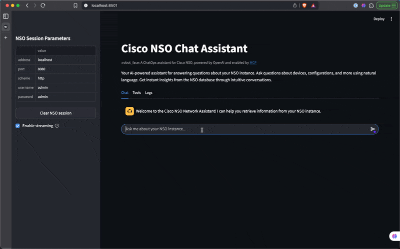 cisco-nso-mcp-server --nso-scheme=http --nso-address=127.0.0.1 --nso-port=8080 --nso-username=admin --nso-password=admin