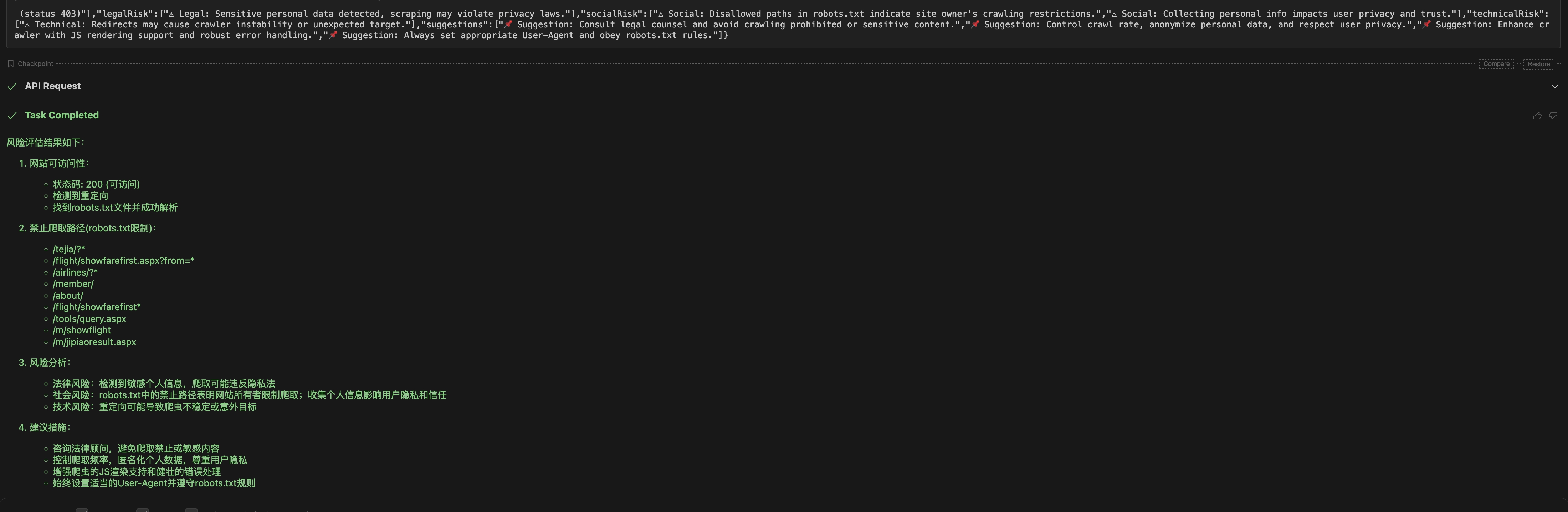 This framework aims to provide crawler developers and operators with a comprehensive automated compliance detection toolset to evaluate the crawler-friendliness and potential risks of target websites. It covers three major dimensions: legal, social ethics, and technical aspects. Through multi-level risk warnings and specific recommendations, it helps plan crawler strategies reasonably to avoid legal disputes and negative social impacts while improving technical stability and efficiency.