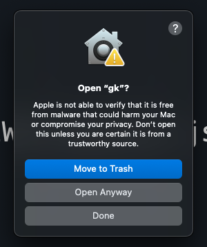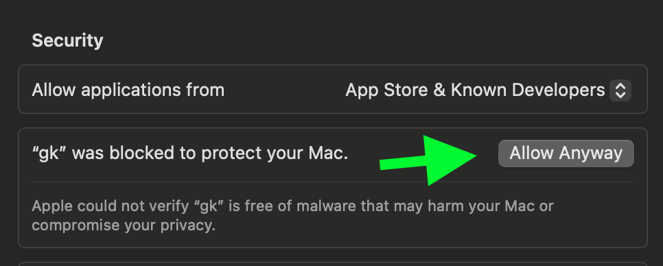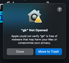 Try running gk setup again and then click "Open Anyway" to continue.