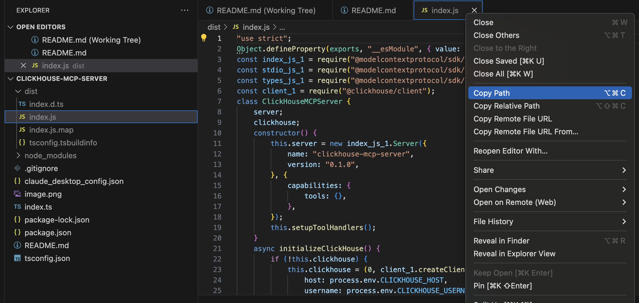 Important: Update the path in the config to point to your actual dist/index.js file location. Copy the full path using as shown in the image below.