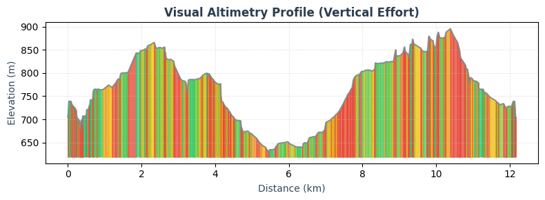 Generates a high-resolution visual analysis of the route's elevation profile. Unlike simple line charts, this tool produces a tactical graphical representation that integrates color-coded slope data, allowing for an immediate assessment of vertical difficulties.