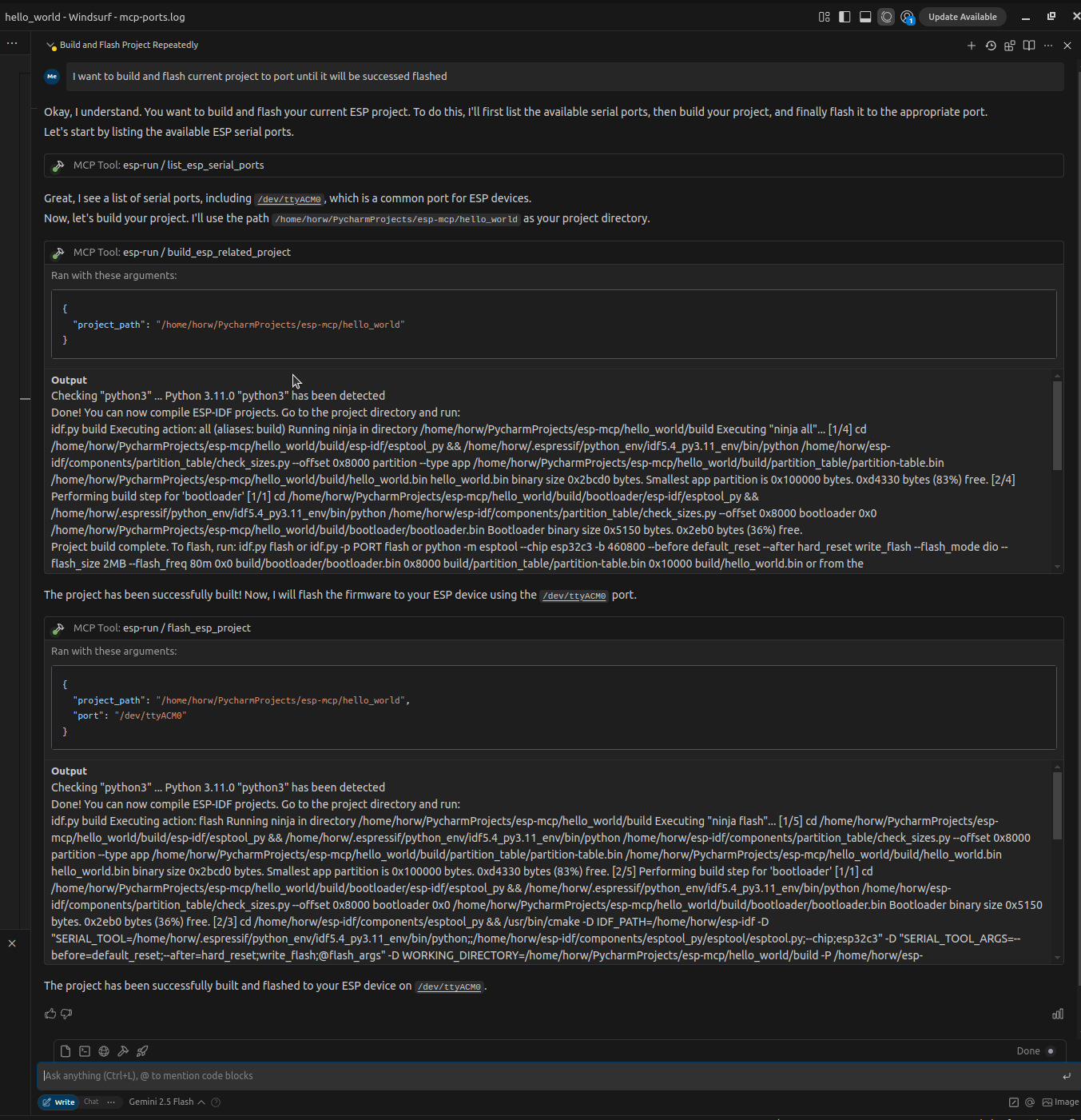 The MCP server will then execute the corresponding ESP-IDF commands (like idf.py build, idf.py set-target, idf.py flash, pytest) based on the tools implemented in main.py.