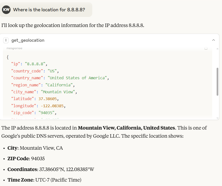In Claude Desktop, the model will automatically generate the output based on the result returned by IP2Location.io MCP server.