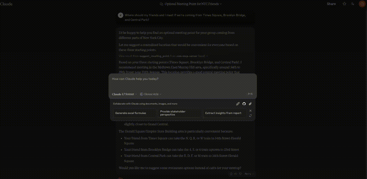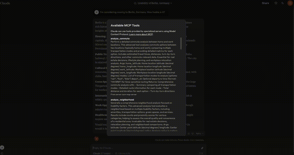 geocode_address: Convert text to geographic coordinatesreverse_geocode: Convert coordinates to human-readable addressesfind_nearby_places: Discover points of interest near a locationget_route_directions: Get turn-by-turn directions between locationssearch_category: Find places of specific categories in an areasuggest_meeting_point: Find optimal meeting spots for multiple peopleexplore_area: Get comprehensive data about a neighborhoodfind_schools_nearby: Locate educational institutions near a specific locationanalyze_commute: Compare transportation options between home and workfind_ev_charging_stations: Locate EV charging infrastructure with filteringanalyze_neighborhood: Evaluate neighborhood livability for real estatefind_parking_facilities: Locate parking options near a destination