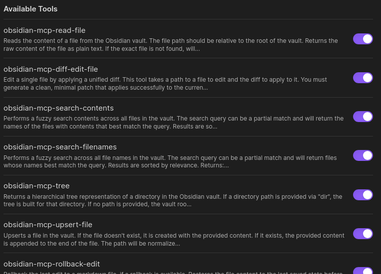 obsidian-mcp-read-file: Get file contentsobsidian-mcp-diff-edit-file: Edit files using simplified udiff (see below)obsidian-mcp-search-contents: Fuzzy search across the contents of all files in your vaultobsidian-mcp-search-filenames: Fuzzy search across all file names in your vaultobsidian-mcp-list-files: List files and directories in your vault with customizable depth and result limitsobsidian-mcp-upsert-file: Create or update filesobsidian-mcp-rollback-edit: Roll back the last edit to a markdown file (reverts the last change made by supported tools)