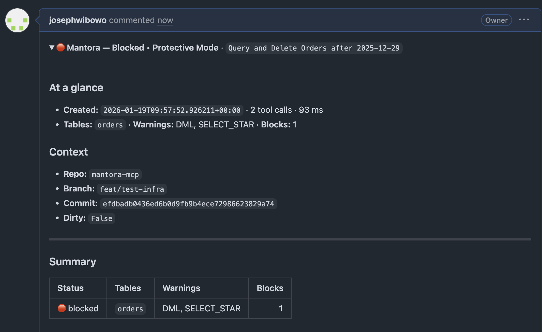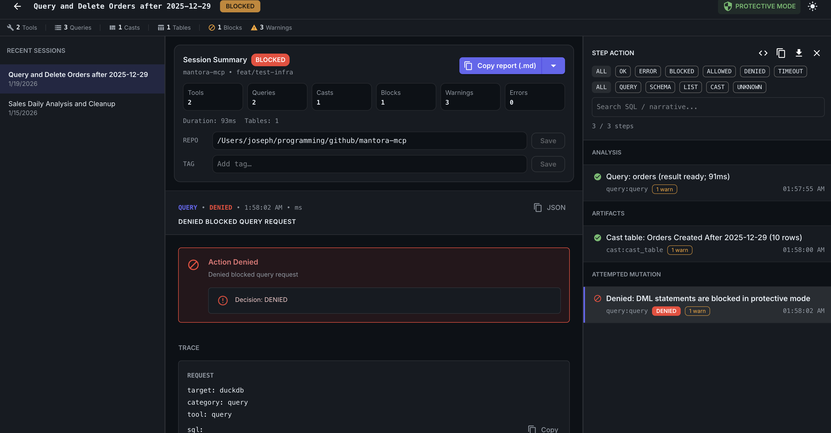 Mantora focuses on making agent behavior reviewable and repeatable. It records the key evidence from each session and turns it into a Markdown report. Protective mode adds basic guardrails (block/warn rules) so you donβt learn about a bad query the hard way.