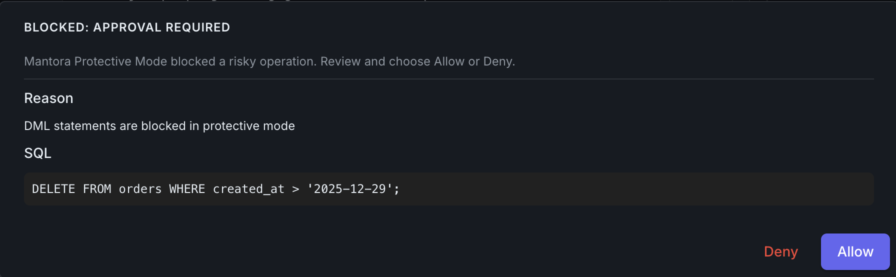 - You see: A red entry in the Mantora UI with the exact SQL that was blocked.