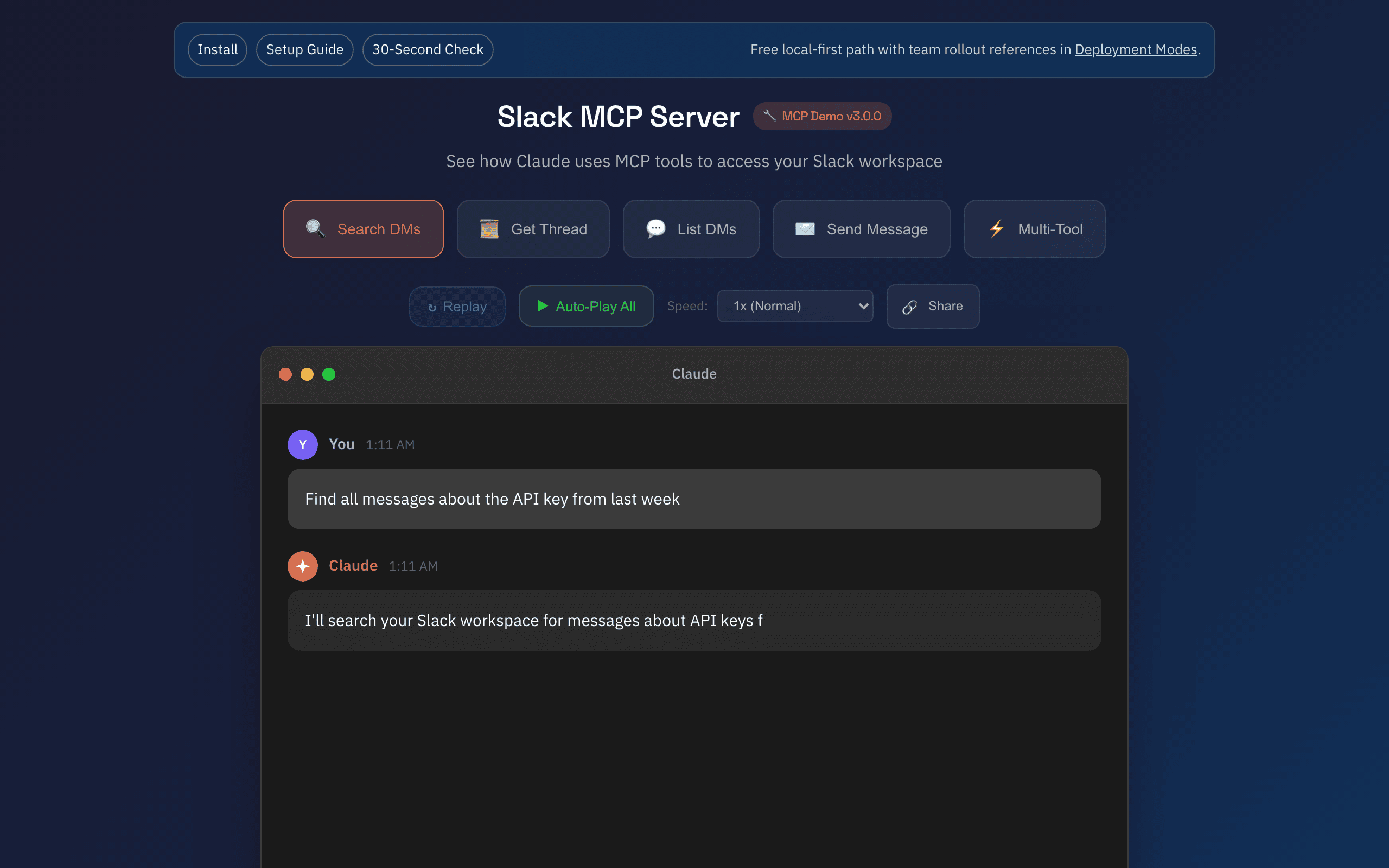 This server bridges the gap. It creates a secure, local bridge between Claude and your Slack web session. It gives your MCP client the same access you already have in the browser—search history, summarize threads, and retrieve prior context—without fighting the platform.