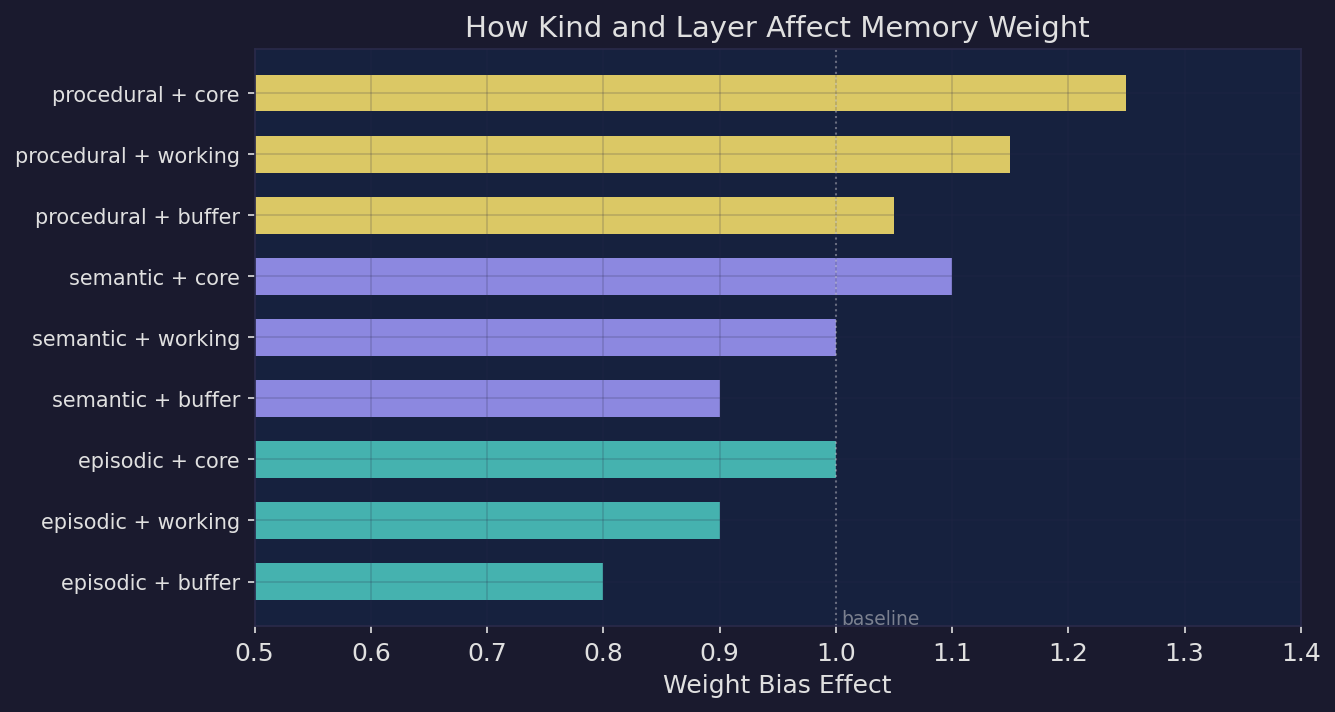![]() | Kind × layer weight bias. Additive biases adjust memory weight by type and layer. Procedural+core memories rank highest, episodic+buffer lowest — but the spread stays bounded so no single combination dominates. |