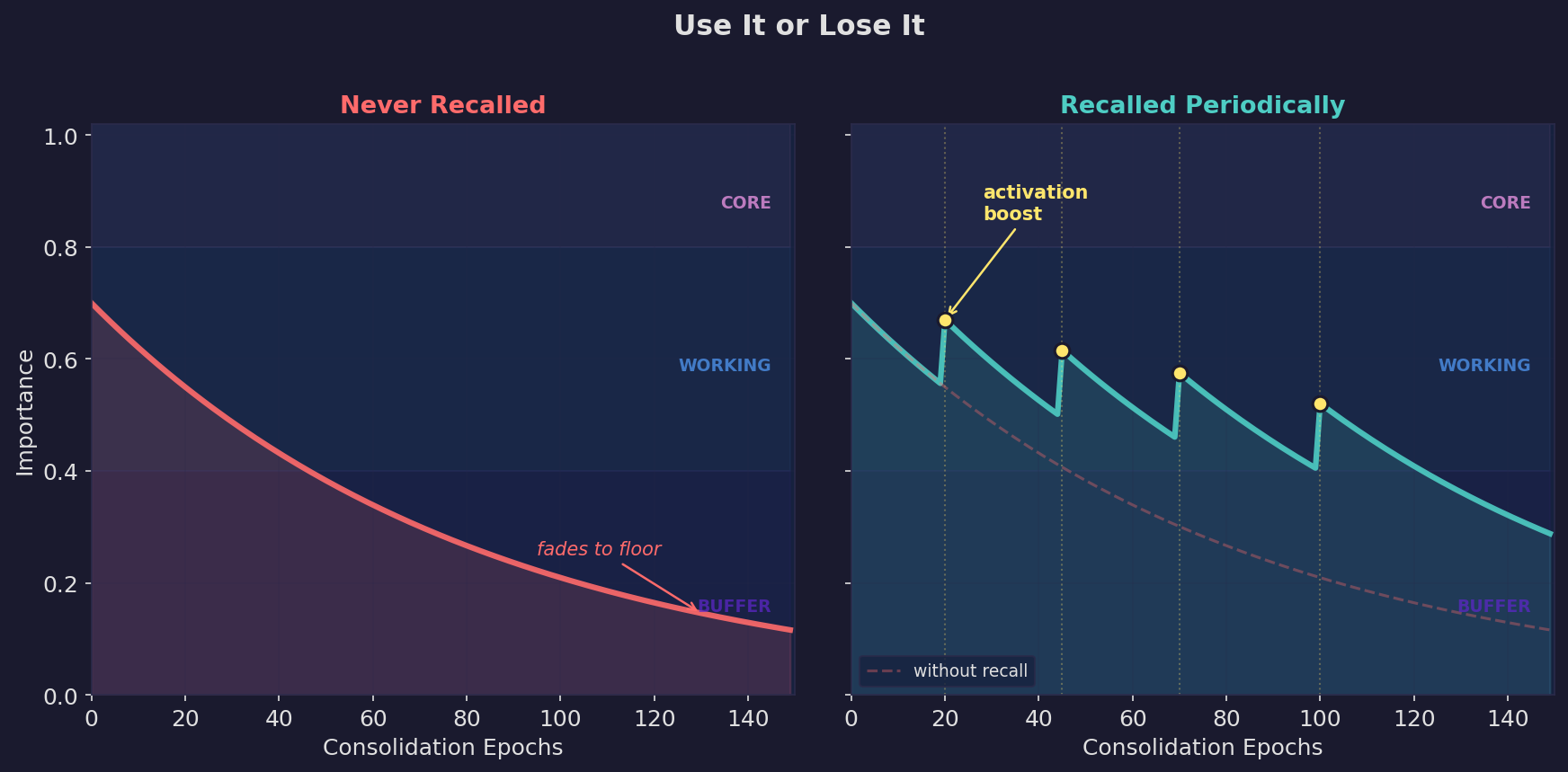 ![]() | Use it or lose it. Left: a memory that's never recalled decays into the buffer layer. Right: periodic recall triggers activation boosts that keep the memory in the working layer. Dashed line shows the unrecalled trajectory for comparison. |