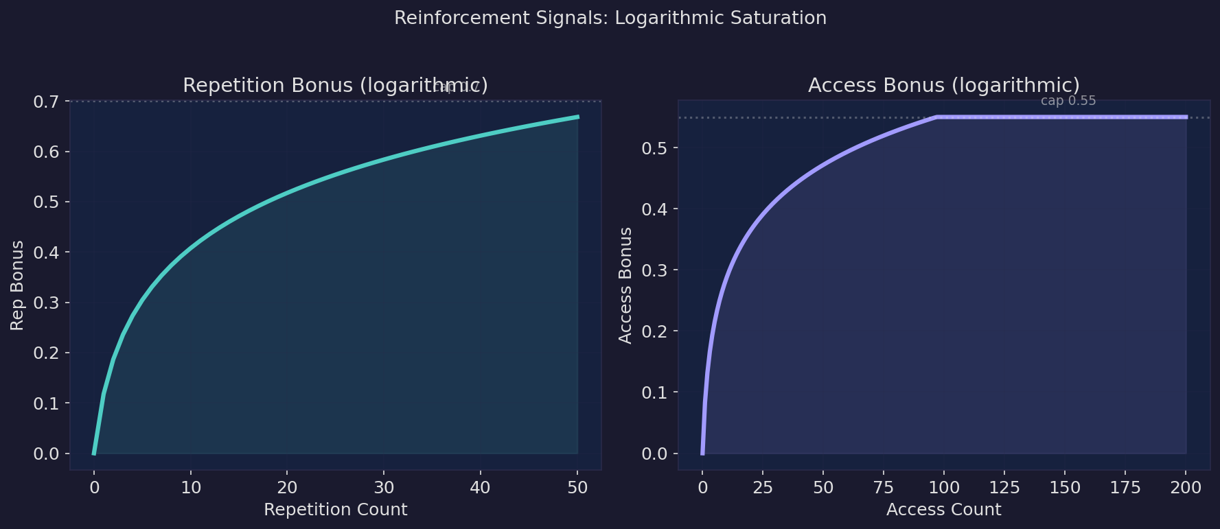 ![]() | Reinforcement signals. Repetition and access bonuses follow logarithmic saturation. Early interactions matter most; later ones contribute diminishing returns, discriminating between "used occasionally" and "used daily". |
