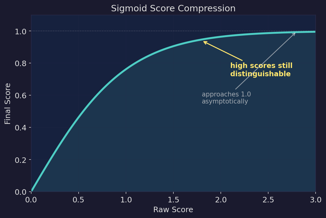 ![]() | Sigmoid score compression. Raw scores are mapped through a sigmoid function, approaching 1.0 asymptotically. High-relevance results remain distinguishable instead of being crushed into the same value. |