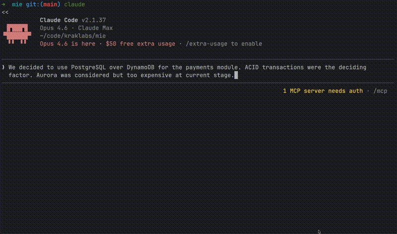 CIE gives your agent deep understanding of your codebase. MIE gives it memory of everything else — decisions, architecture, people, events. Together, your agent knows your code and remembers why it's built that way.