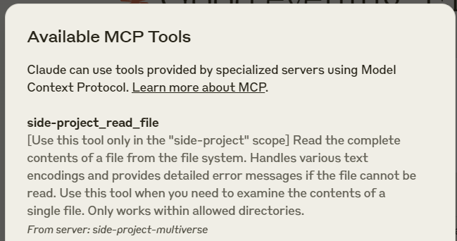 mcp-server-filesystem's functions will be exposed withside-projectprefix, e.g.side-project_read_file,side-project_write_file. - The root path can be hidden from the client (e.g. Claude Desktop) by using the