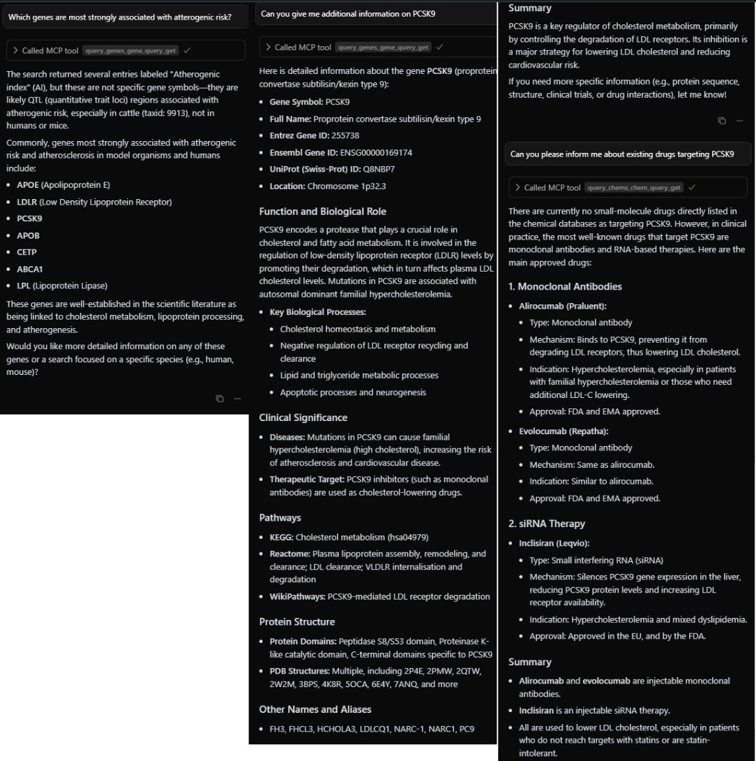 Here's a real conversation (that you can easily reproduce yourself as all MCP-es are working and covered with tests) showing Holy Bio MCP servers working together to answer complex research questions, demonstrating the power of this integrated approach: