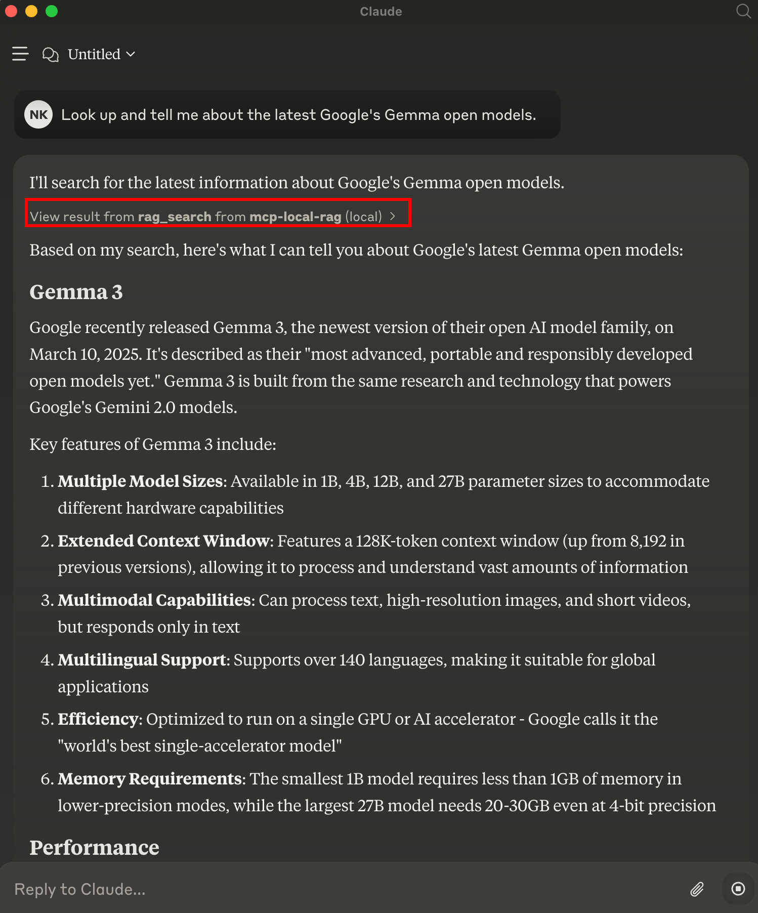 mcp-local-rag performs a live web search, extracts context, and sends it back to the model—giving it fresh knowledge: