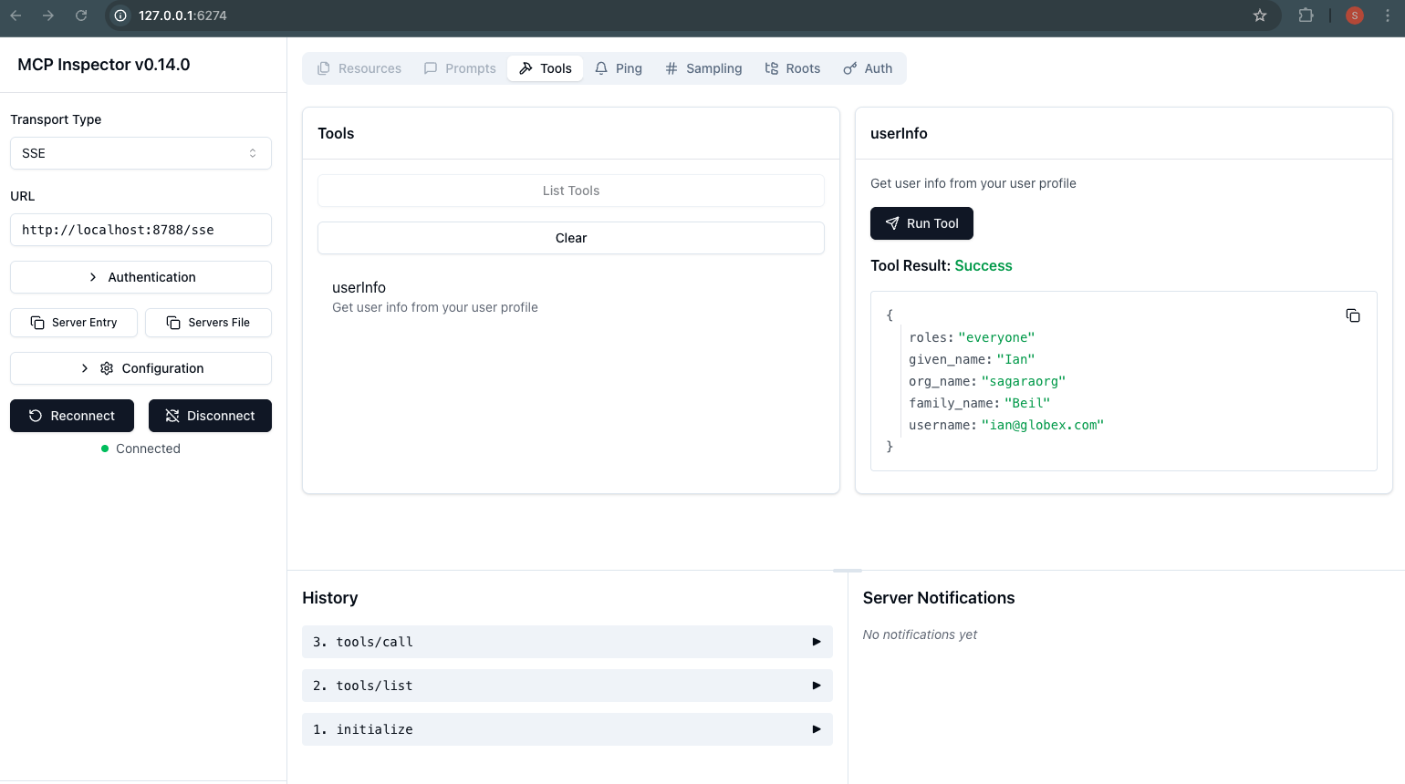To test the local server, switch the Transport Type to SSE and enter http://localhost:8788/sse in the Inspector and hit connect. Once you follow the prompts, you’ll be able to authenticate with Asgardeo and use features such as “List Tools” in the Inspector. When you invoke the userInfo tool, you should see results similar to the example shown in the screenshot below.