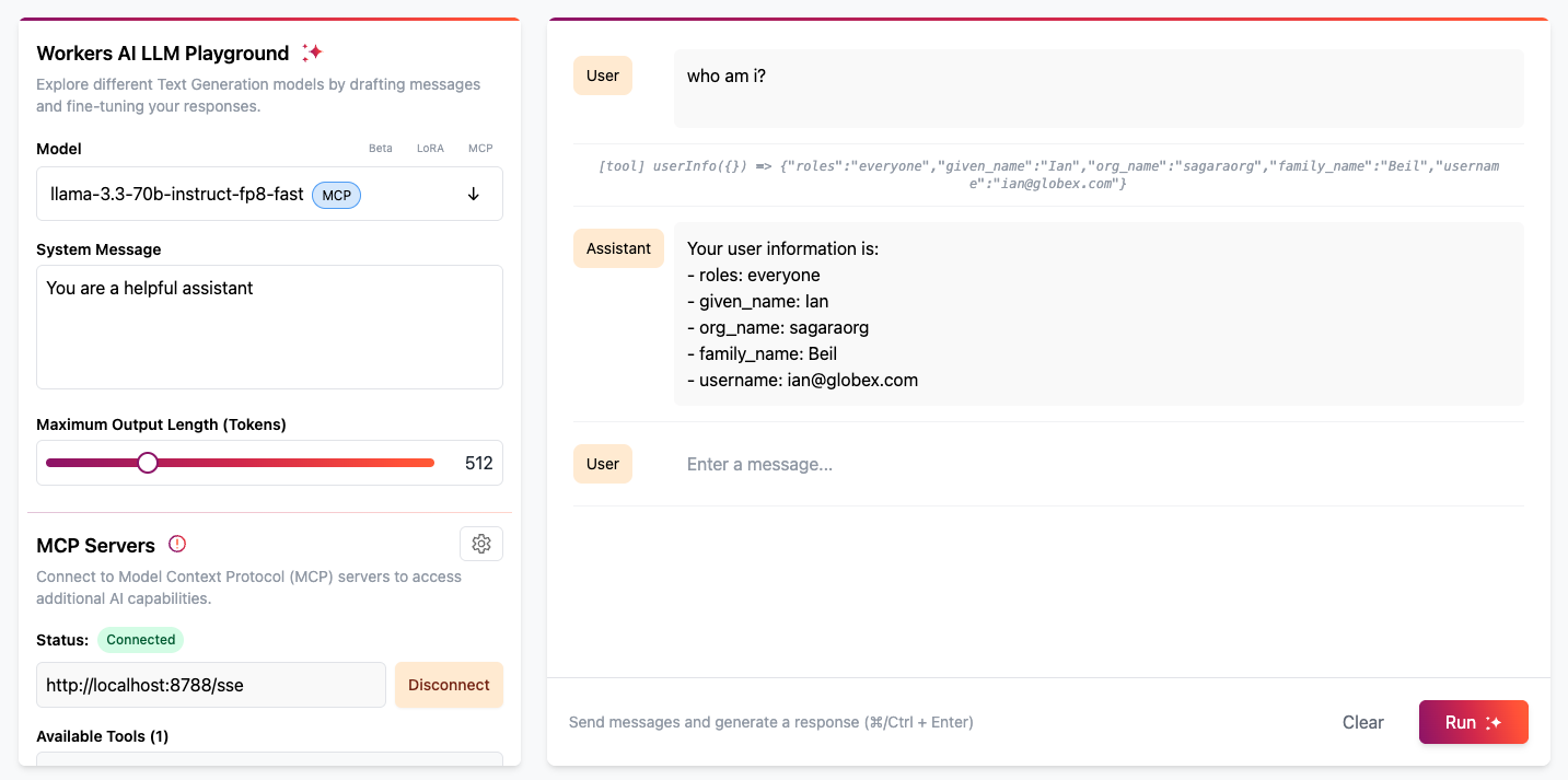 Simply enter http://localhost:8787/sse as the MCP server URL and click Connect. This will redirect you to the Asgardeo login page. Once you've completed the login process, you’ll be able to interact with the LLM in the Playground and use the tools defined in your MCP server.