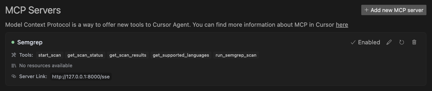 security_check: Scan code for security vulnerabilitiessemgrep_scan: Scan code files for security vulnerabilities with a given config stringsemgrep_scan_with_custom_rule: Scan code files using a custom Semgrep rule