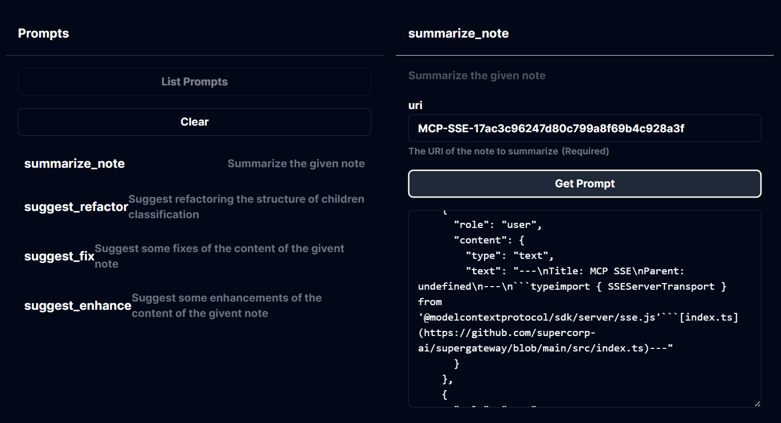 summarize_note: Summarize a specific note by URI.suggest_refactor: Propose structural improvements.suggest_fix: Identify potential fixes for note content.suggest_enhance: Recommend enhancements to improve the note.
