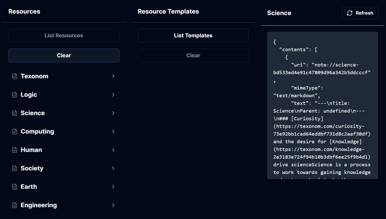 note://URIs with UUID slugs. - Metadata: Each resource includes a title, description, and content in Markdown format.
