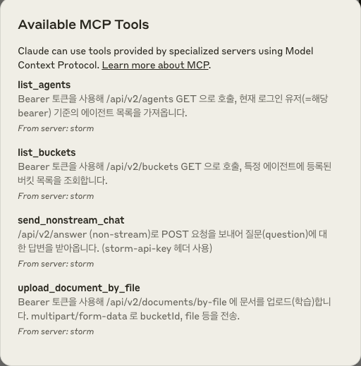 Storm MCP(Model Context Protocol) 서버는 LLM 애플리케이션과 RAG 데이터 소스 및 도구들 간의 원활한 통합을 가능하게 하는 개방형 프로토콜입니다. Anthropic의 Model Context Protocol을 구현하여 Claude Desktop에서 Storm Platform을 바로 이용합니다.