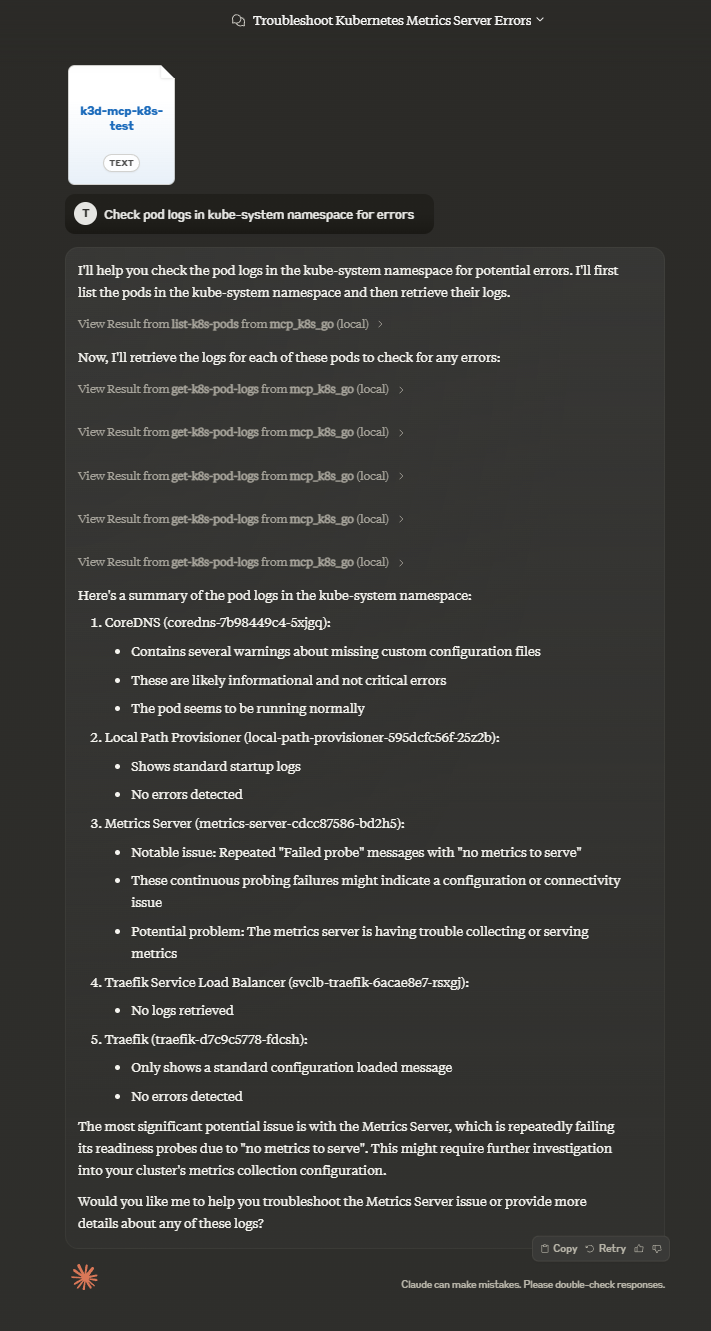 Following chat with Claude Desktop demonstrates how it looks when selected particular context as a resource and then asked to check pod logs for errors in kube-system namespace: